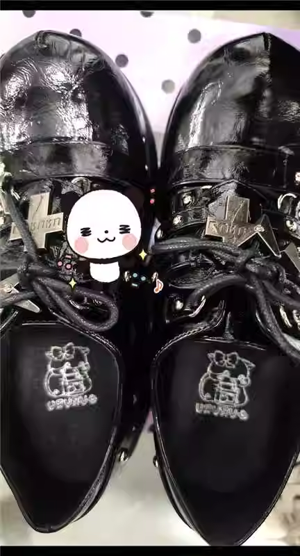 Featuring a unique heart-shaped plate and custom cross-shaped hardware design, these shoes combine punk edge with Lolita charm.